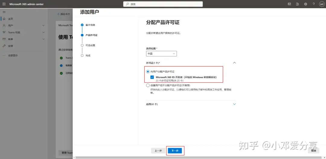 5.填写基本信息后,点击下一步,进入产品许可将向用户产品许可证勾选上(勾选后对方就可以获得23个许可证)非常实用的,一直点击下一步直到添加完毕,如图所示: