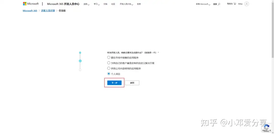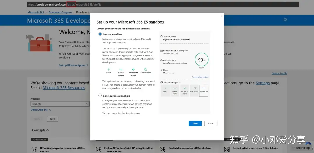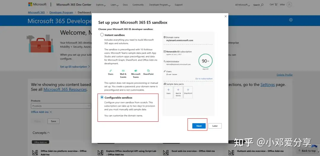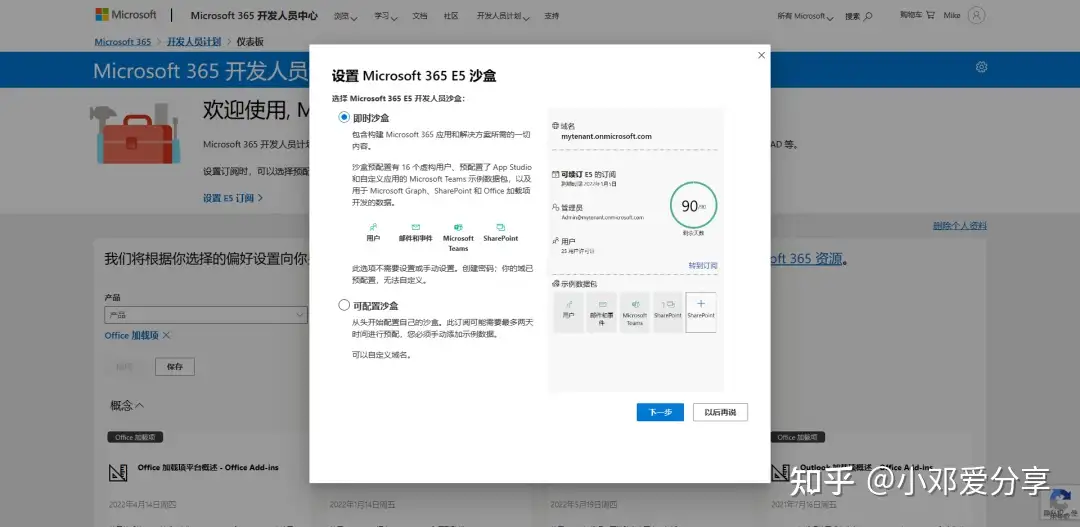 6.你感兴趣的Microsoft 365 开发领域是什么?也随便选择一个,点击保存会进入到设置 Microsoft 365 E5 沙盒,如图所示: