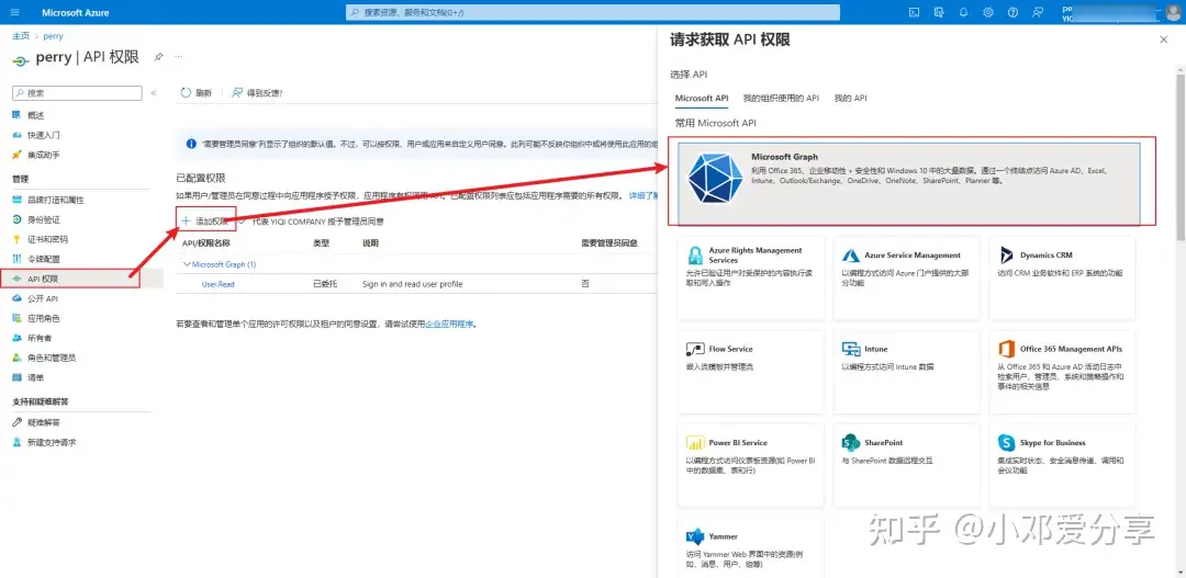 5.点击左侧的API权限,点击添加权限,点击常用 Microsoft API选项,如图所示: