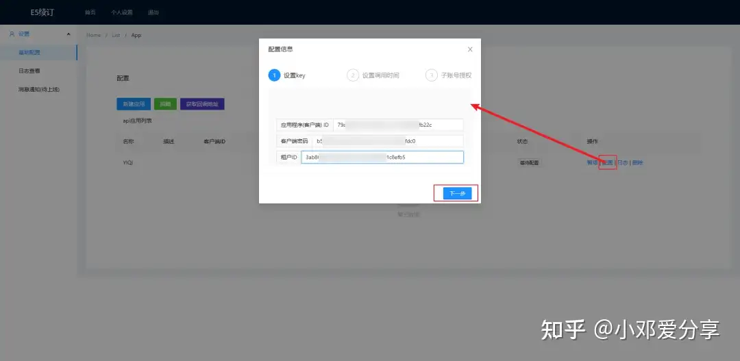 15.点击配置,输入应用客户端ID、密码及租户ID(注意:第二个是要输入密码),点击下一步,调用时间默认即可,最后授权登录验证即可,如图所示: