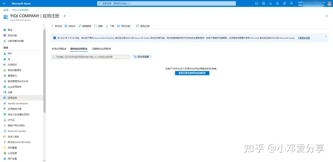 因为E5开发者账号有效期是3个月,为了能够自动延续要调用它的API接口(地址:https://portal.azure.com/#blade/Microsoft_AAD_IAM/ActiveDirectoryMenuBlade/RegisteredApps),打开后登录E5开发者账号,进入应用注册,如图所示: