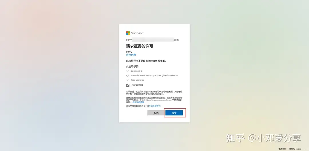 16.选择账户并勾选代表组织同意,点击接受,显示授权成功就可以了,如图所示: