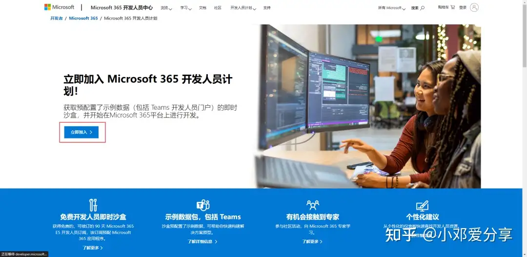 2.输入申请地址(https://developer.microsoft.com/zh-cn/office/dev-program),进入后点击立即加入,如图所示: