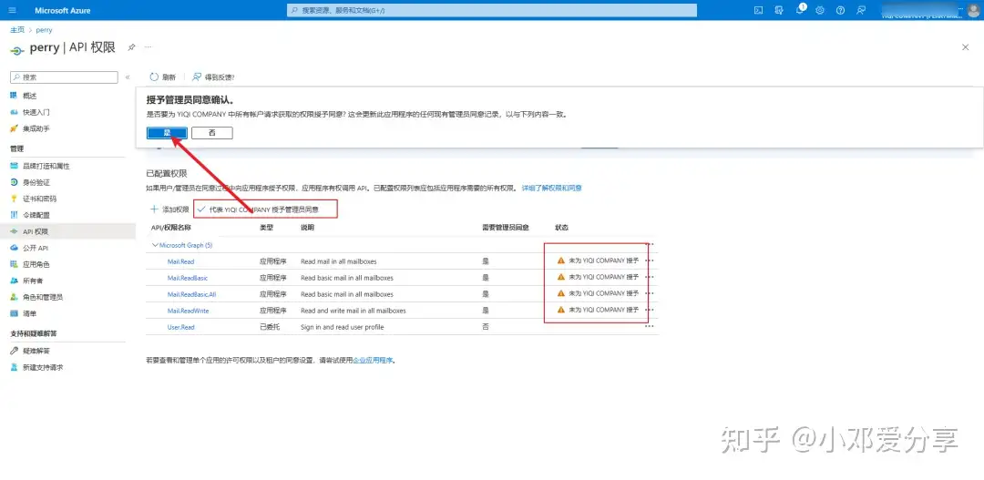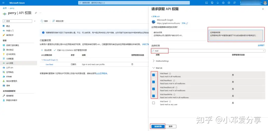 6.打开以后点击右侧的应用程序权限,在搜索框输入mail,点击mail把前4个选项勾选上,点击添加权限,如图所示: