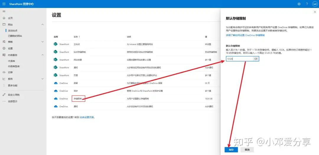 3.点击存储限制,将默认的1024改为5120,输入完保存即可(这样的话空间就有5T了),如图所示:
