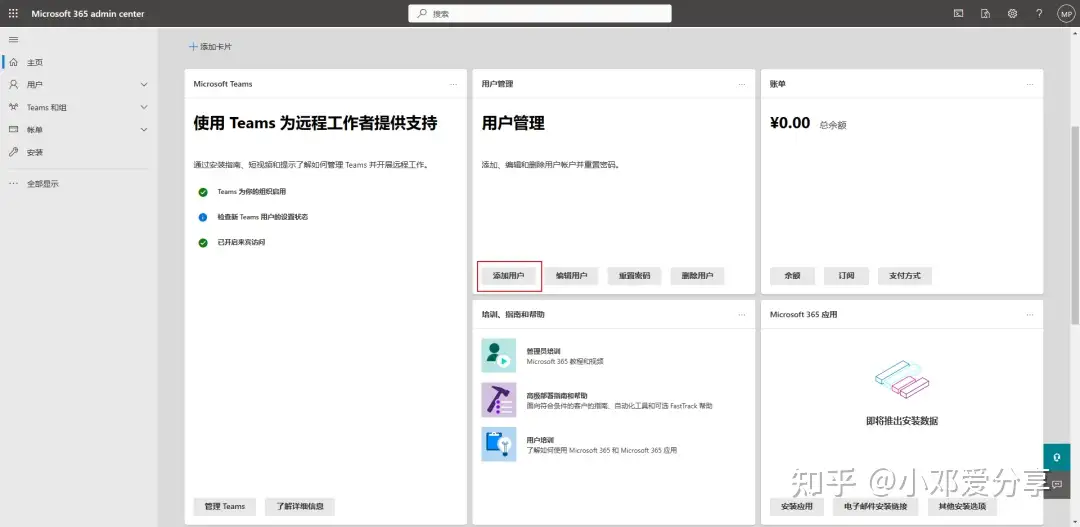 4.如果想要账号使用权限分享给朋友或家人,进入链接(https://admin.microsoft.com/Adminportal/Home#/homepage)进入后找到用户管理,点击添加用户,如图所示: