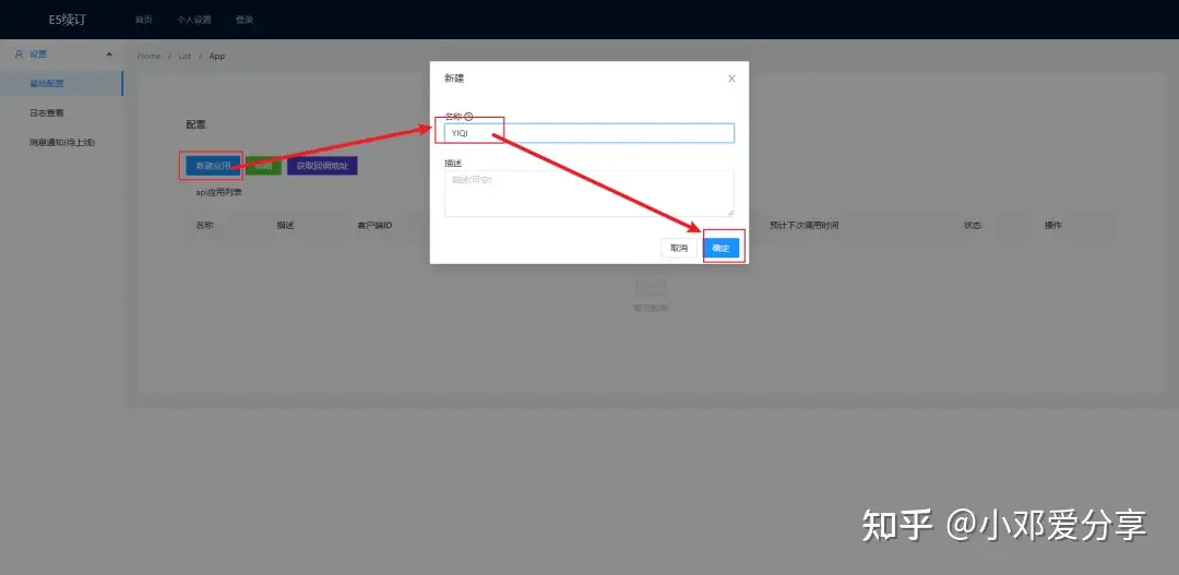 14.添加完后,返回续订页面,点击新建应用,名称自拟,如图所示:
